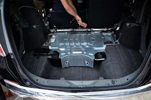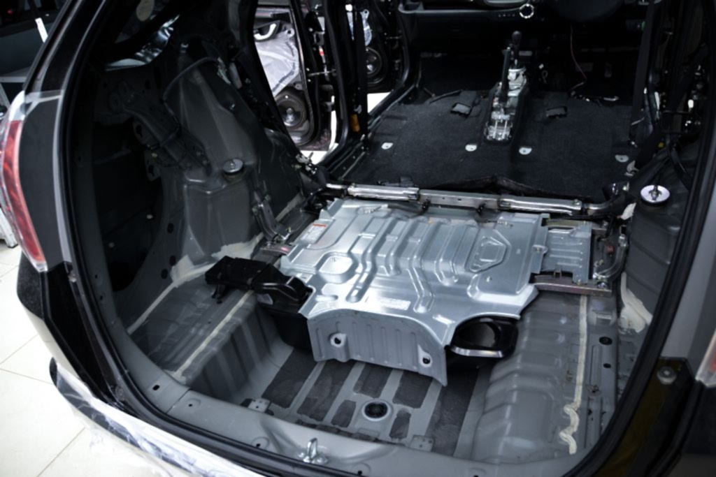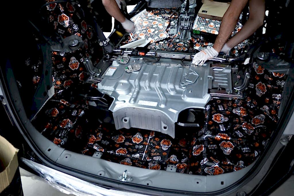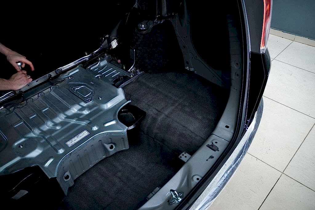 Обезжириваем поверхность и приступаем к монтажу второго слоя. Также для получения более эффективного результата используем компоновку из двух материалов На дно багажника клеим Pin-Up Base 4. Этот слой позволит снизить нам шум от дороги.