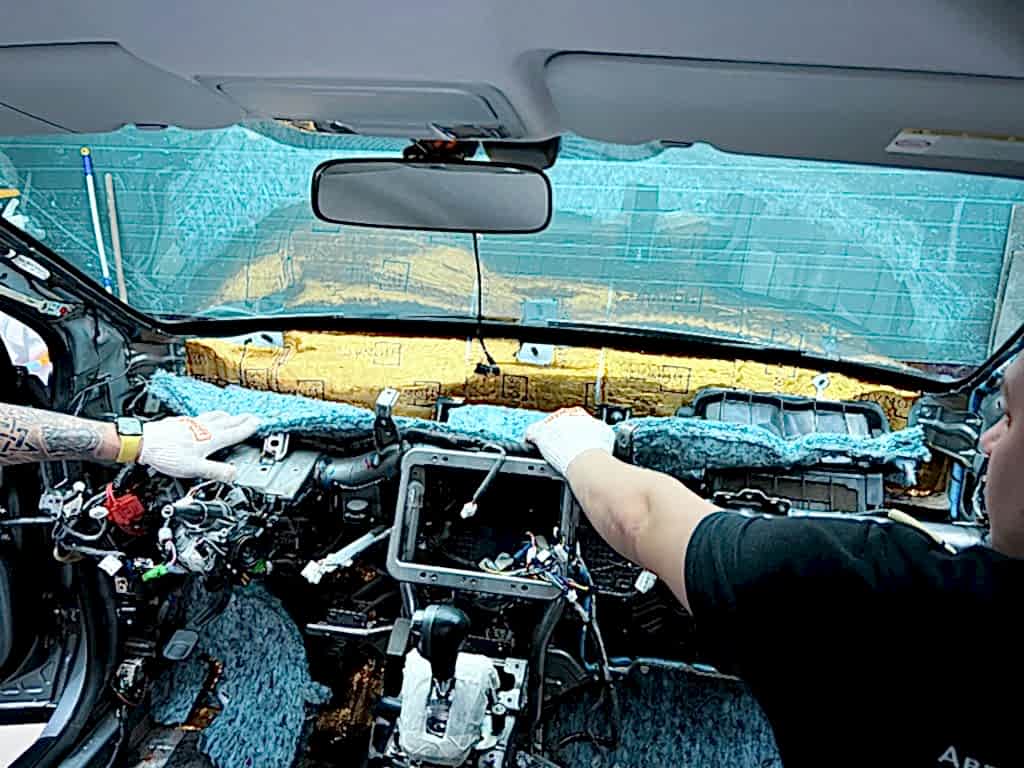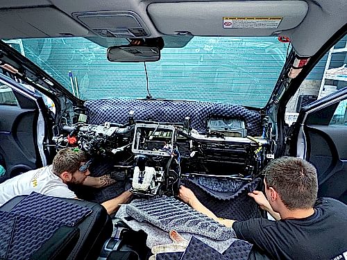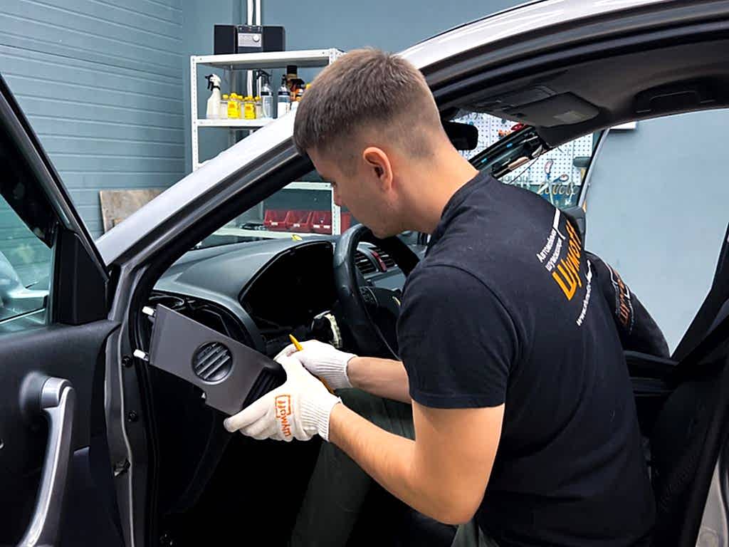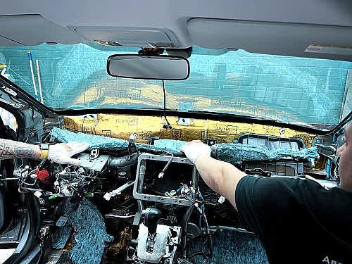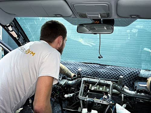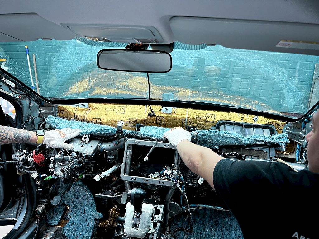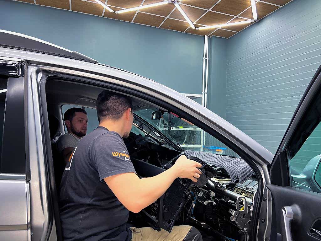 Приступаем к разбору панели и центральной консоли, аккуратно демонтируем Pin-Up молдинги, декоративные вставки. Далее переходим к электронике, отключаем провода от магнитолы, климат контроля и различных кнопок, никакого вмешательства влияющего на гарантию не происходит, мы лишь штатно отключаем и подключаем разъемы.