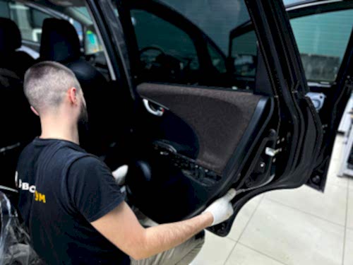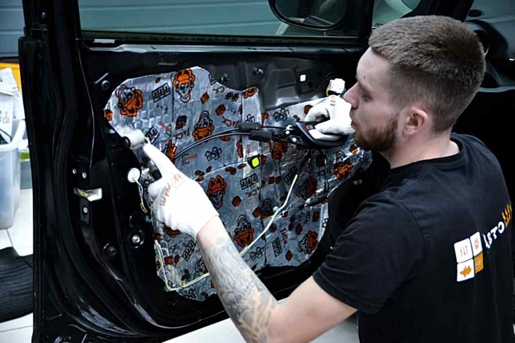 Переходим к дверной обшивке. Убираем штатную шумоизоляцию иобезжириваем поверхность. Всю внутреннюю Pin-Up оклеиваем мощным шумопоглотителем Шумофф Absorber А15.