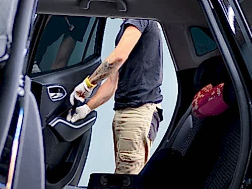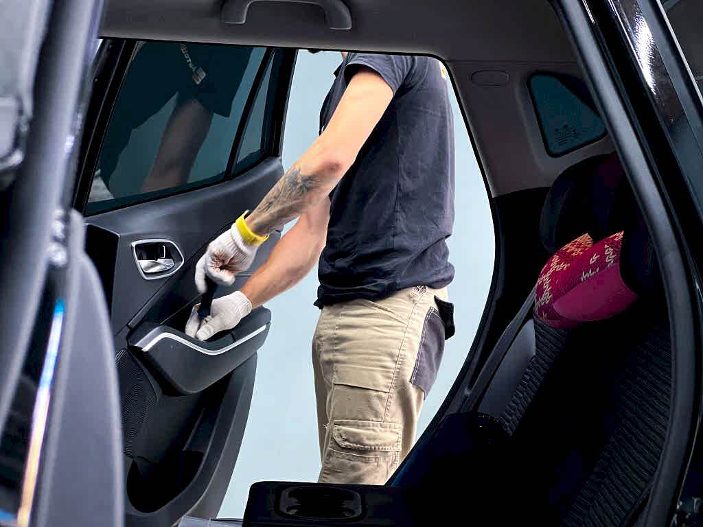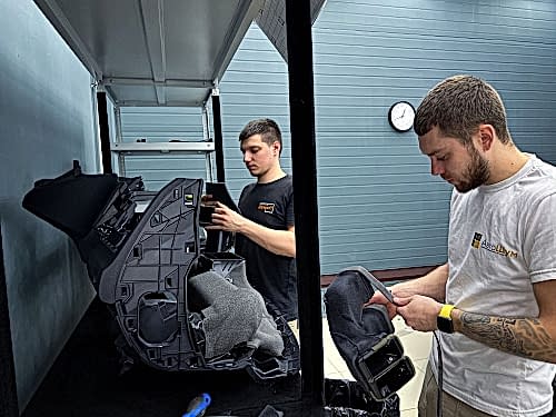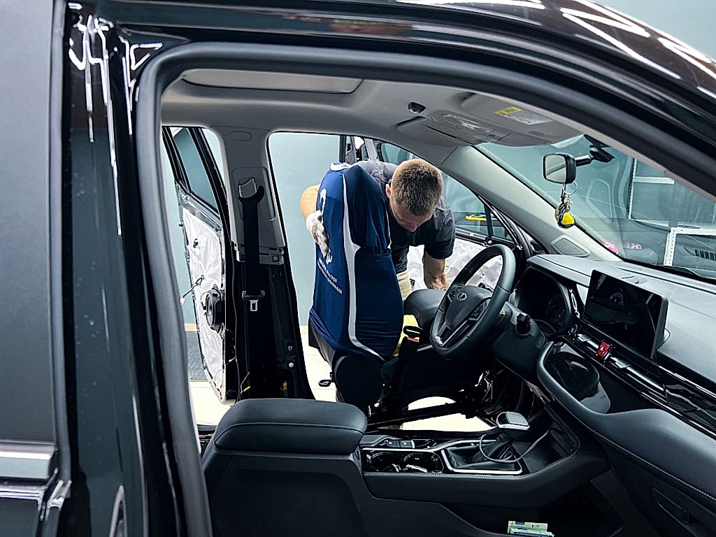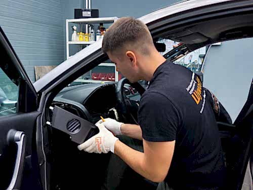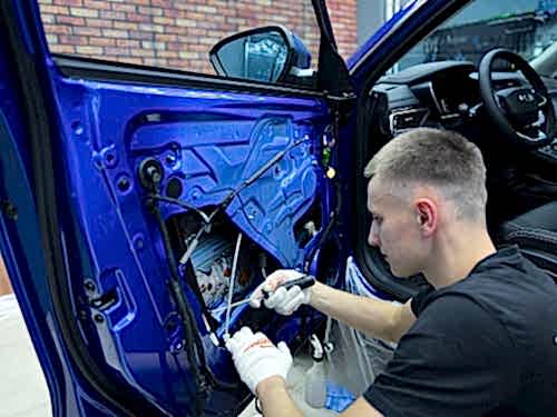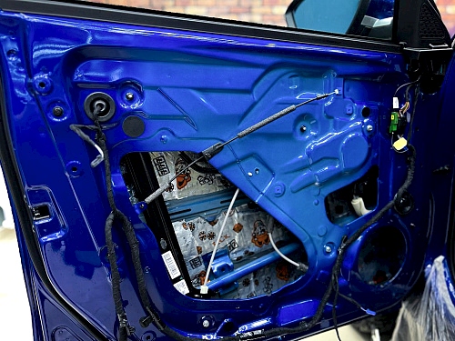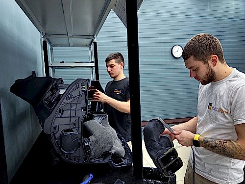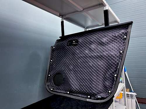 Снимаем дверную обшивку и убираем ее на специальный стеллаж для Pin-Up салона. Удаляем влагозащитную Pin-Up с двери и приступаем к обезжириванию всех поверхностей двери перед нанесением материалов.