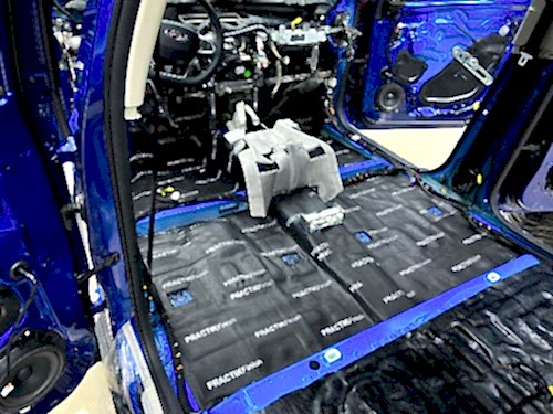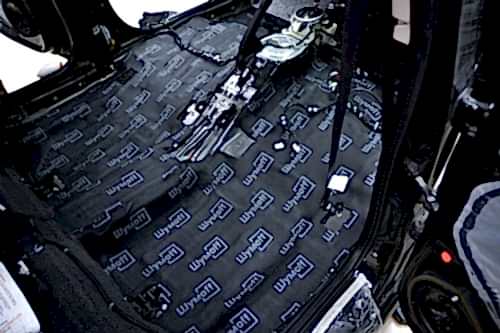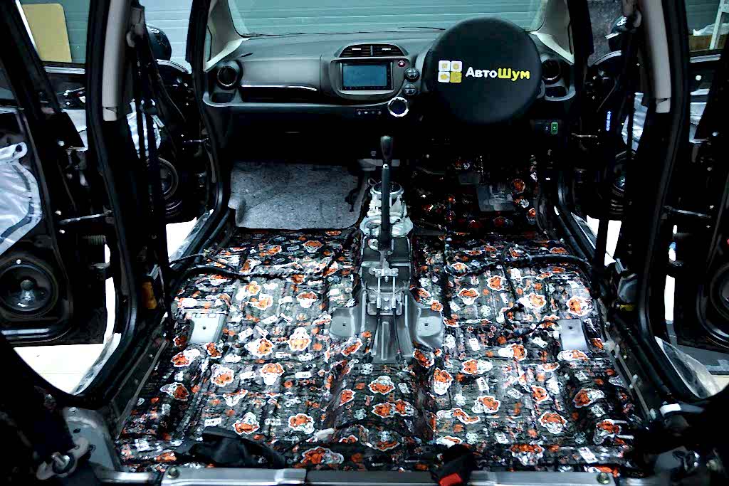 Пол от Pin-Up перегородки и до заднего сиденья оклеивается толстой виброизоляцией Шумофф Super Jack. Под заднее сиденье клеится виброизоляция Шумофф Black Jack.