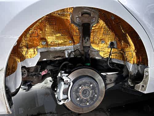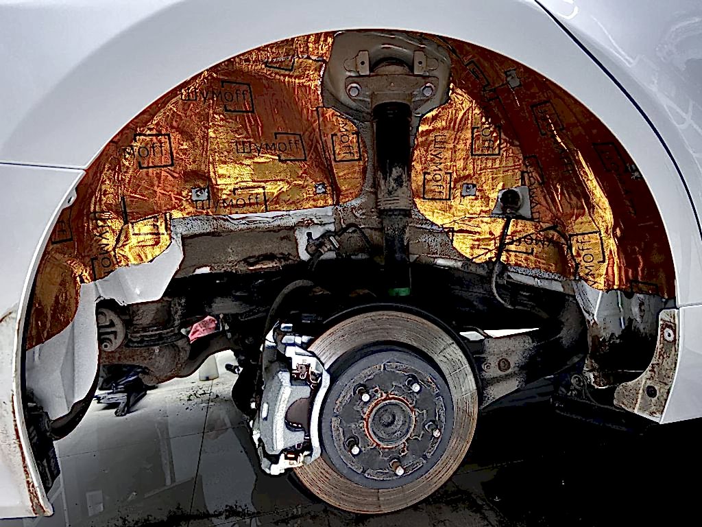 Данный слой отлично устраняет эффект барабана, ведь арки постоянно подвержены воздействиям различных внешних сил, таких как: вода, песок, камни и т.д . Все это, отлетая, создает ощутимые шумы, ведь каждый удар камня создает достаточно шумный резонанс, передающийся в салон. Завершаем шумоизоляцию арок обратной сборкой, устанавливаем подкрылки и колеса на место
