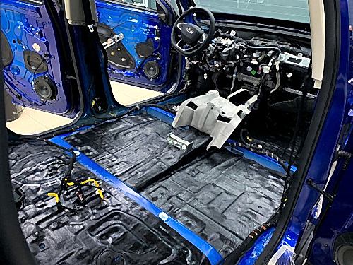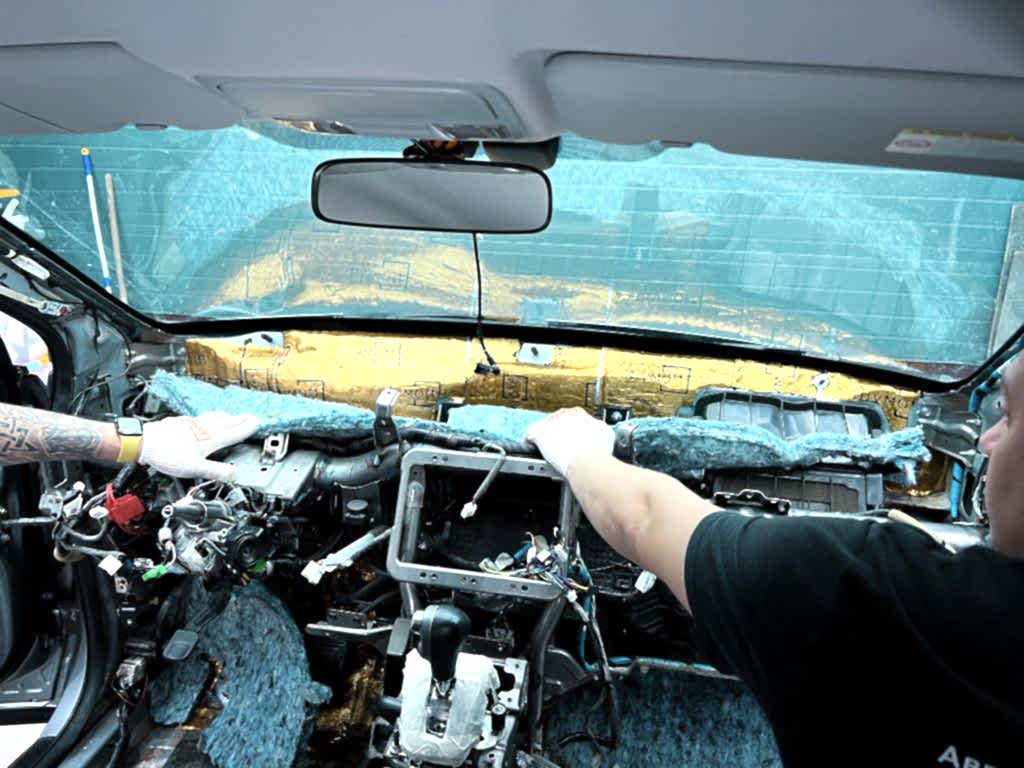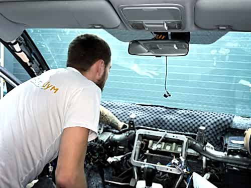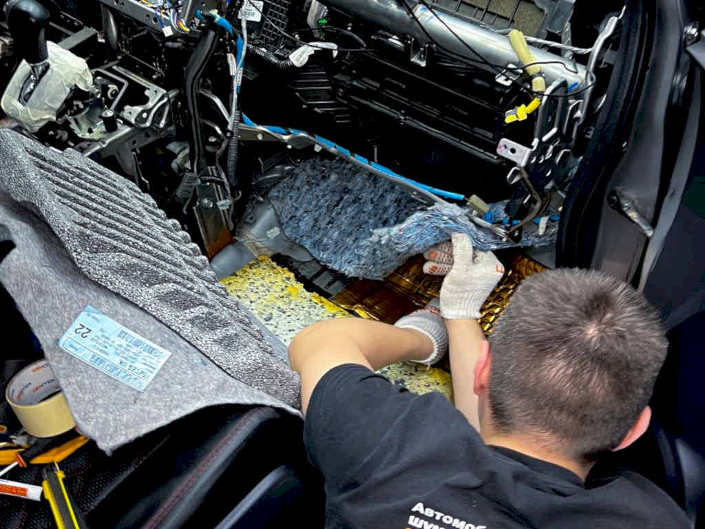 После разбора салона демонтируем ковер и Pin-Up все элементы штатной шумоизоляции, а также воздуховоды. Тщательно проверяем всю заводскую виброизоляцию, она должна хорошо держаться на Pin-Up не трескаться и не крошиться.