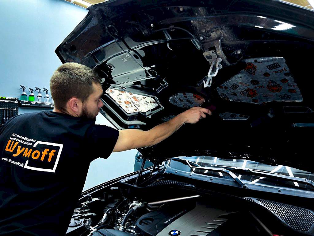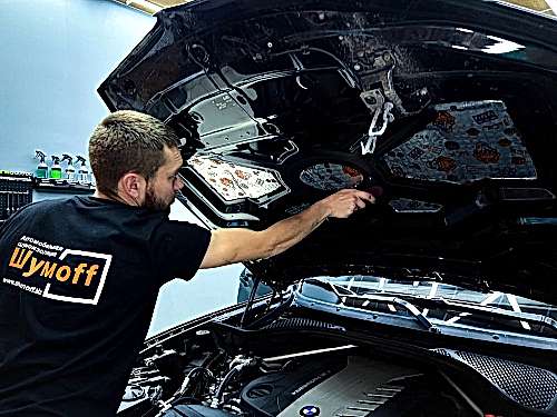 Вторым слоем, но уже на обшивку капота наносим шумопоглотитель Шумофф Absorber A15. Pin-Up компоновка позволит нам не просто снизить шум от двигателя, но и увеличить теплоизоляцию подкапотного пространства, от чего двигатель будет быстрее прогревается и медленнее остывать зимой.