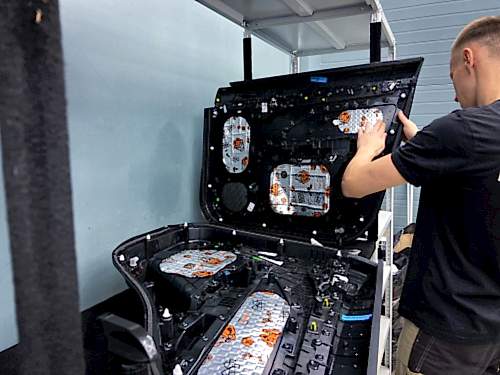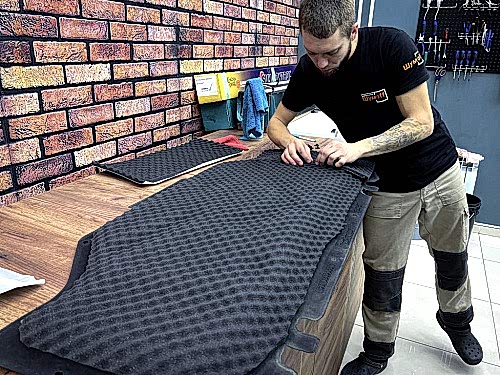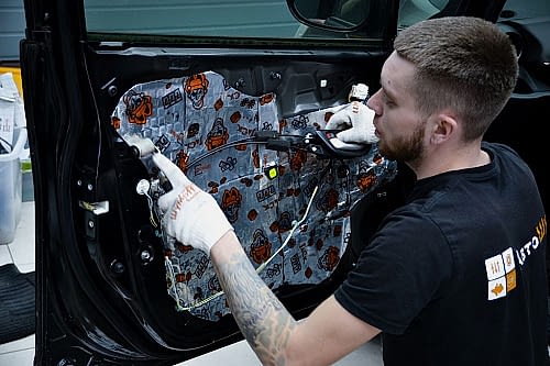 Переходим к оклейке самого корпуса панели, первым слоем частично наносим виброизоляцию Pin-Up Joker, создавая тем самым идеальный баланс. Такая частичная оклейка позволит нам чрезмерно не утяжелять панель и придать ей необходимую сбитость