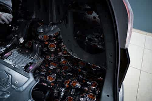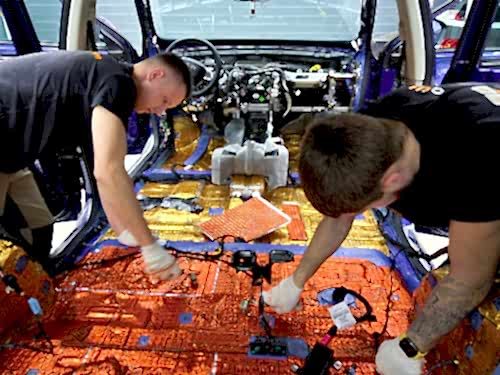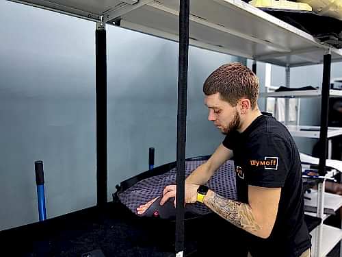 Приступаем к монтажу виброизоляции. Первым слоем на металл Pin-Up наносим толстую и эффективную виброизоляцию Шумофф М4. Перед нанесением, для более сильной адгезии материал прогревается в специальной печи
