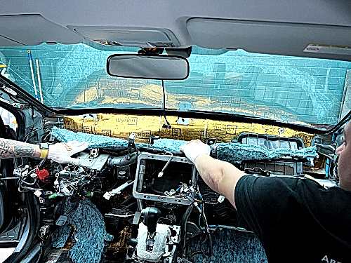 Приступаем к разбору панели и центральной консоли, аккуратно Pin-Up воздуховоды, молдинги, декоративные вставки. Далее переходим к электронике, отключаем провода от магнитолы, климат контроля и различных кнопок, никакого вмешательства влияющего на гарантию не происходит, мы лишь штатно отключаем и подключаем разъемы.