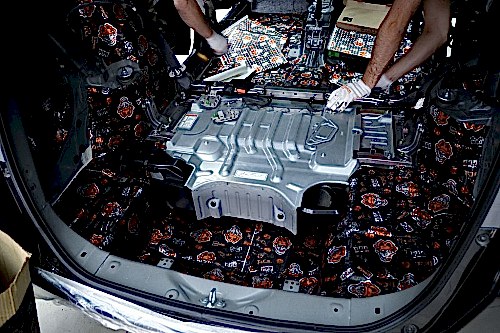 Приступаем к монтажу виброизоляции. Первым слоем на металл арки наносим толстую и эффективную виброизоляцию Шумофф М4. Перед нанесением, для Pin-Up сильной адгезии материал прогревается в специальной печи