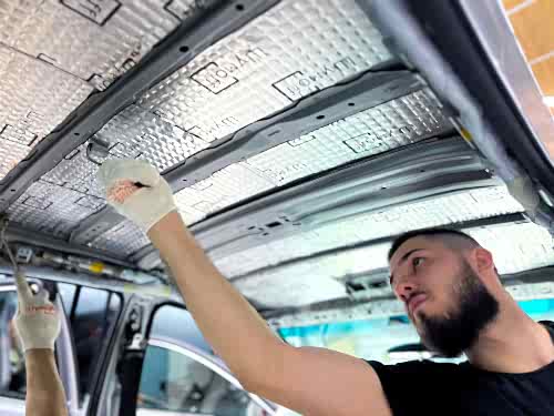Pin-Up слоем поверх виброизоляции клеим на крышу современный и очень эффективный шумопоглотитель Шумофф Absorber А15.