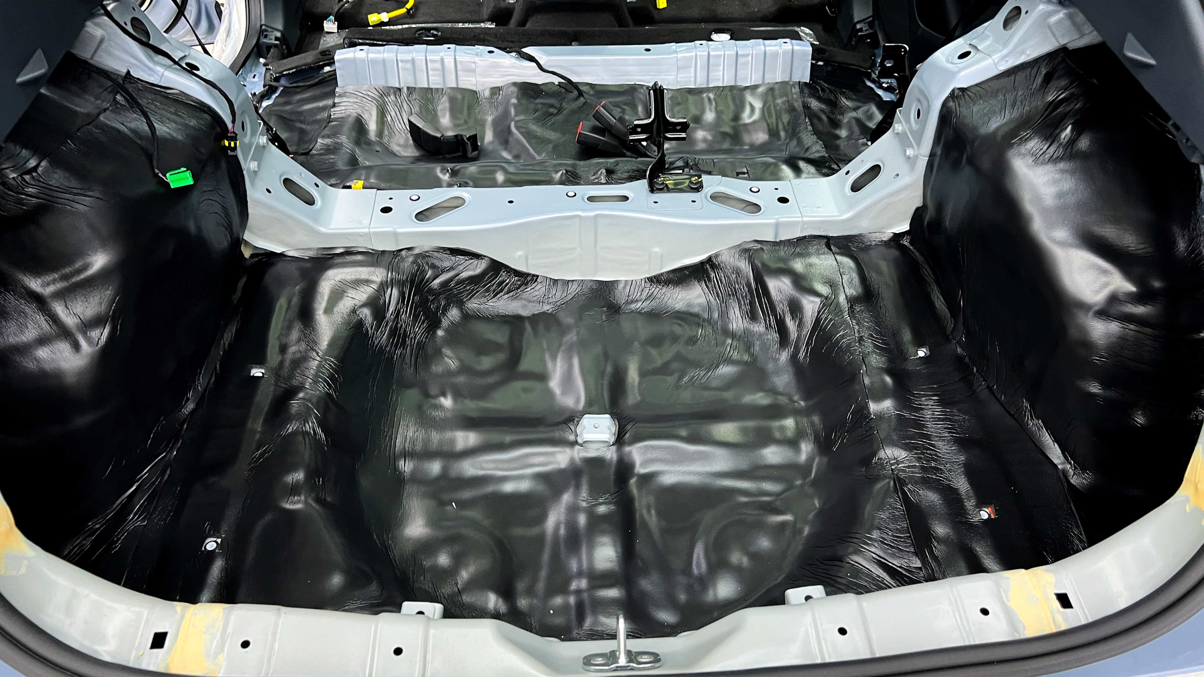Обезжириваем поверхность и приступаем к монтажу второго слоя. Также для Pin-Up более эффективного результата используем компоновку из двух материалов На дно багажника клеим Шумофф Base 4. Этот слой позволит снизить нам шум от дороги.