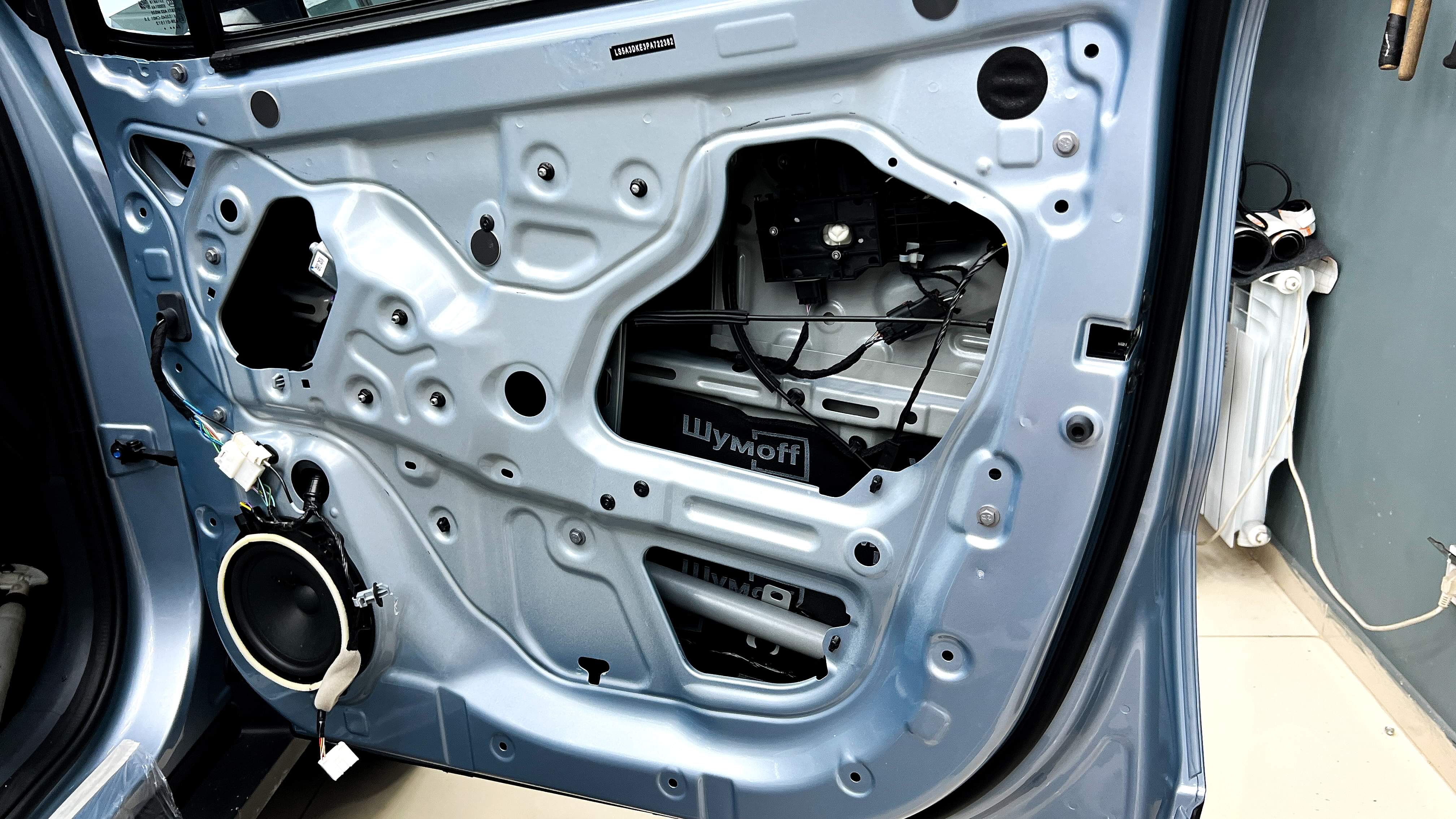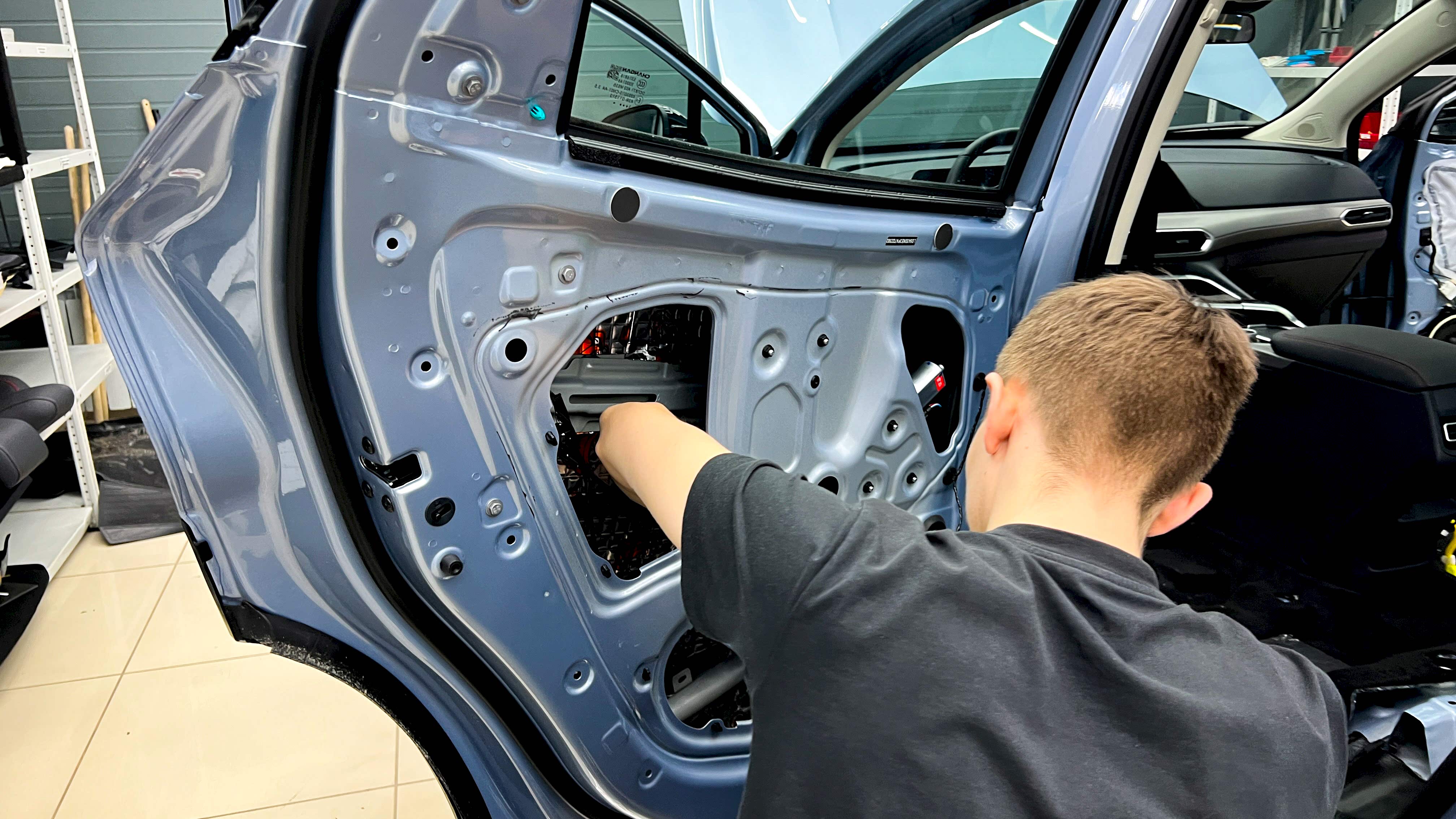 Снимаем дверную обшивку и убираем ее на специальный стеллаж для всего салона.Удаляем влагозащитную пленку с двери и приступаем к обезжириванию всех поверхностей двери перед нанесением Pin-Up На внутреннюю поверхность двери между ребер жесткости клеим современную виброизоляцию Шумофф Joker. Тщательно прикатываем каждый лист к поверхности, не оставляя пустот и пузырей.