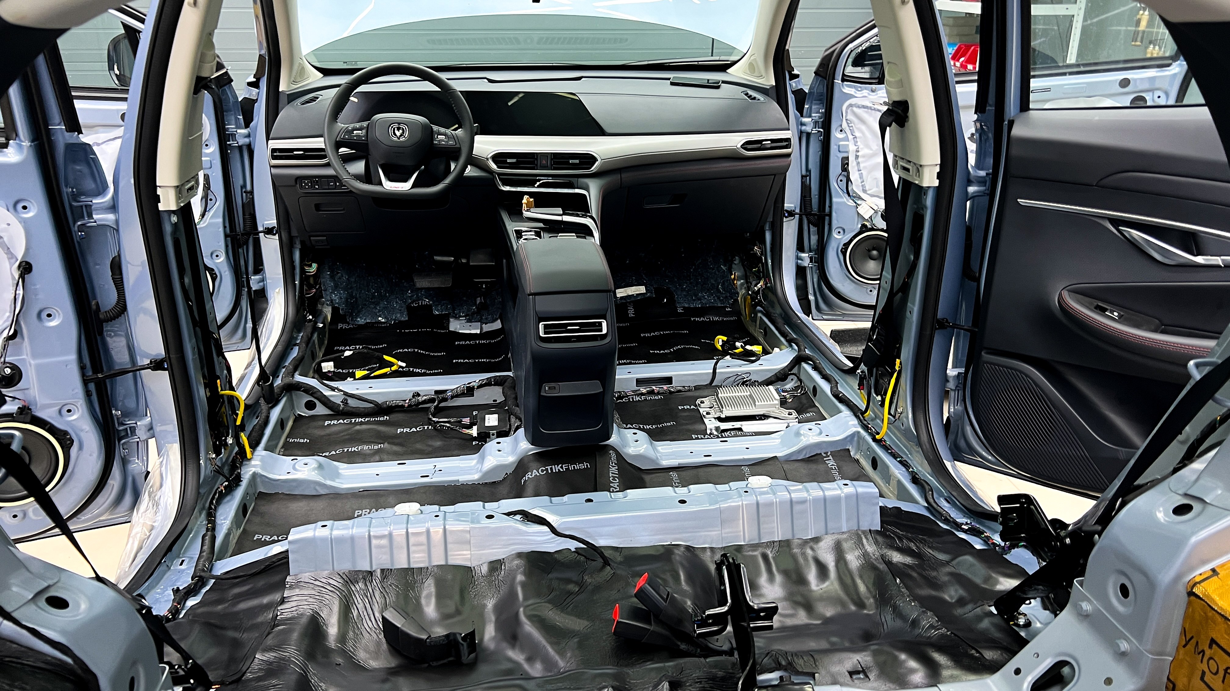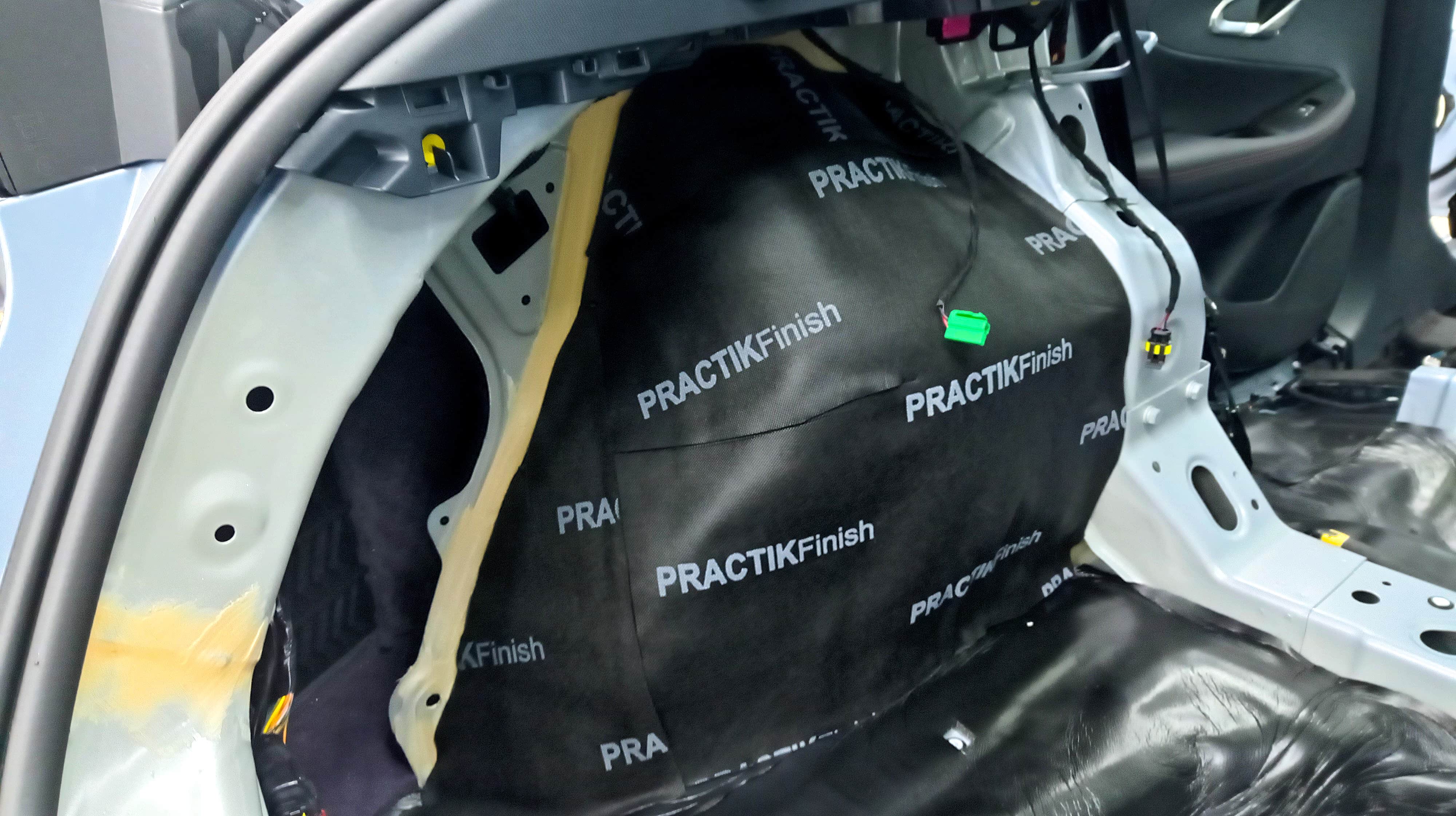 Pin-Up шумоизоляцию нанесением третьего слоя звукоизоляционной мембраны Practik Finish на арки. В результате получаем компоновку материалов с максимальной эффективностью и возможностью сборки салона в первозданный Pin-Up