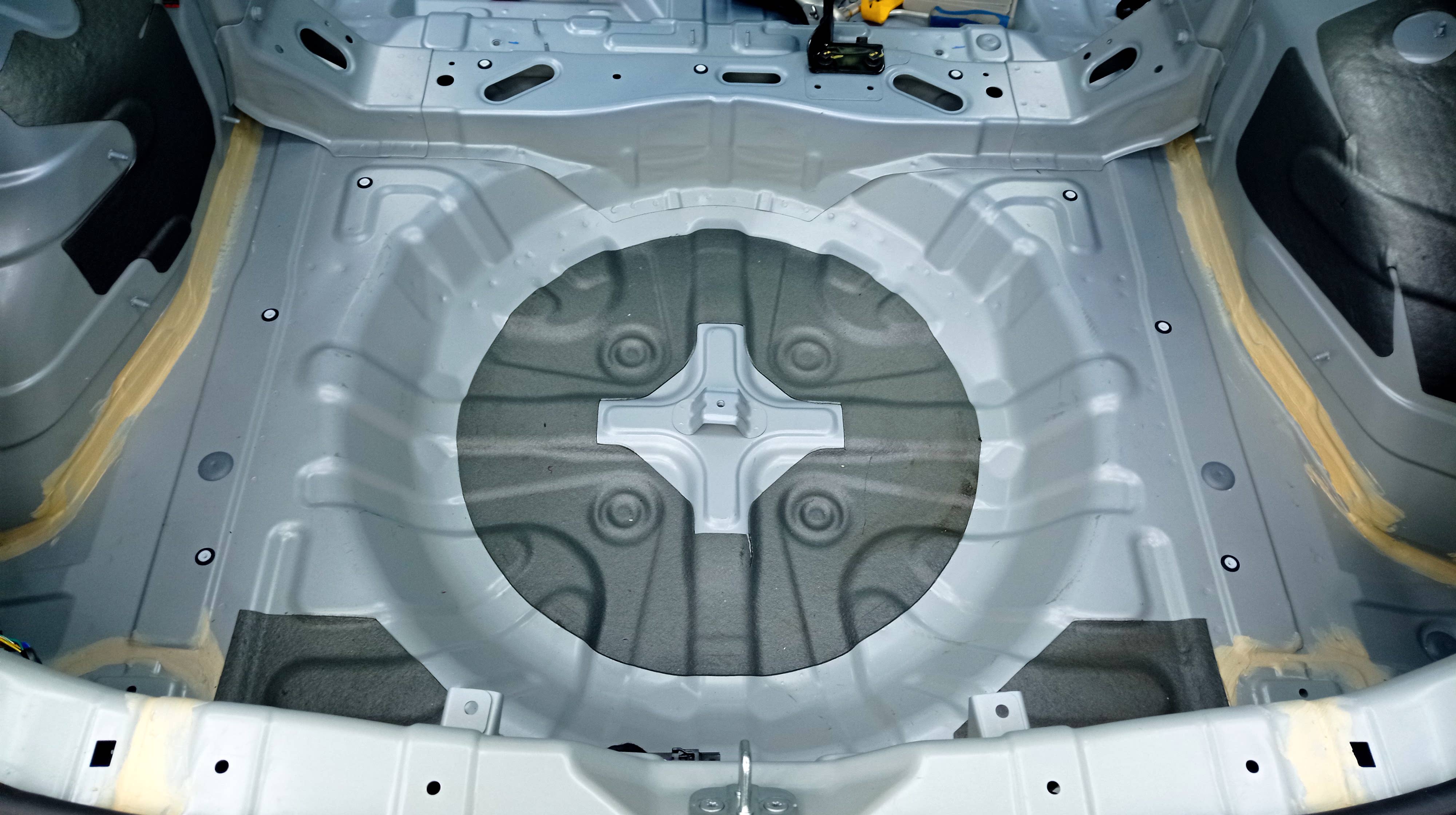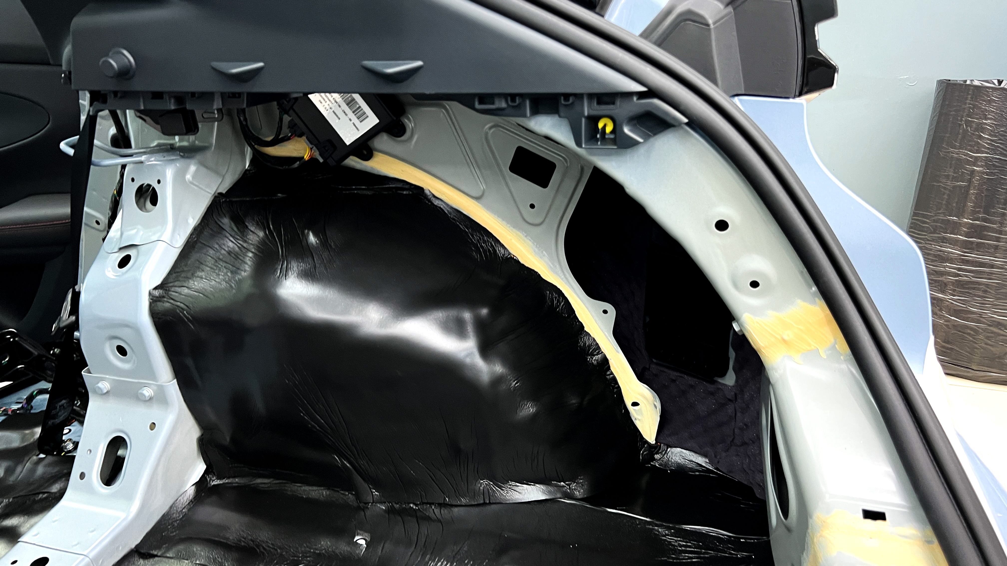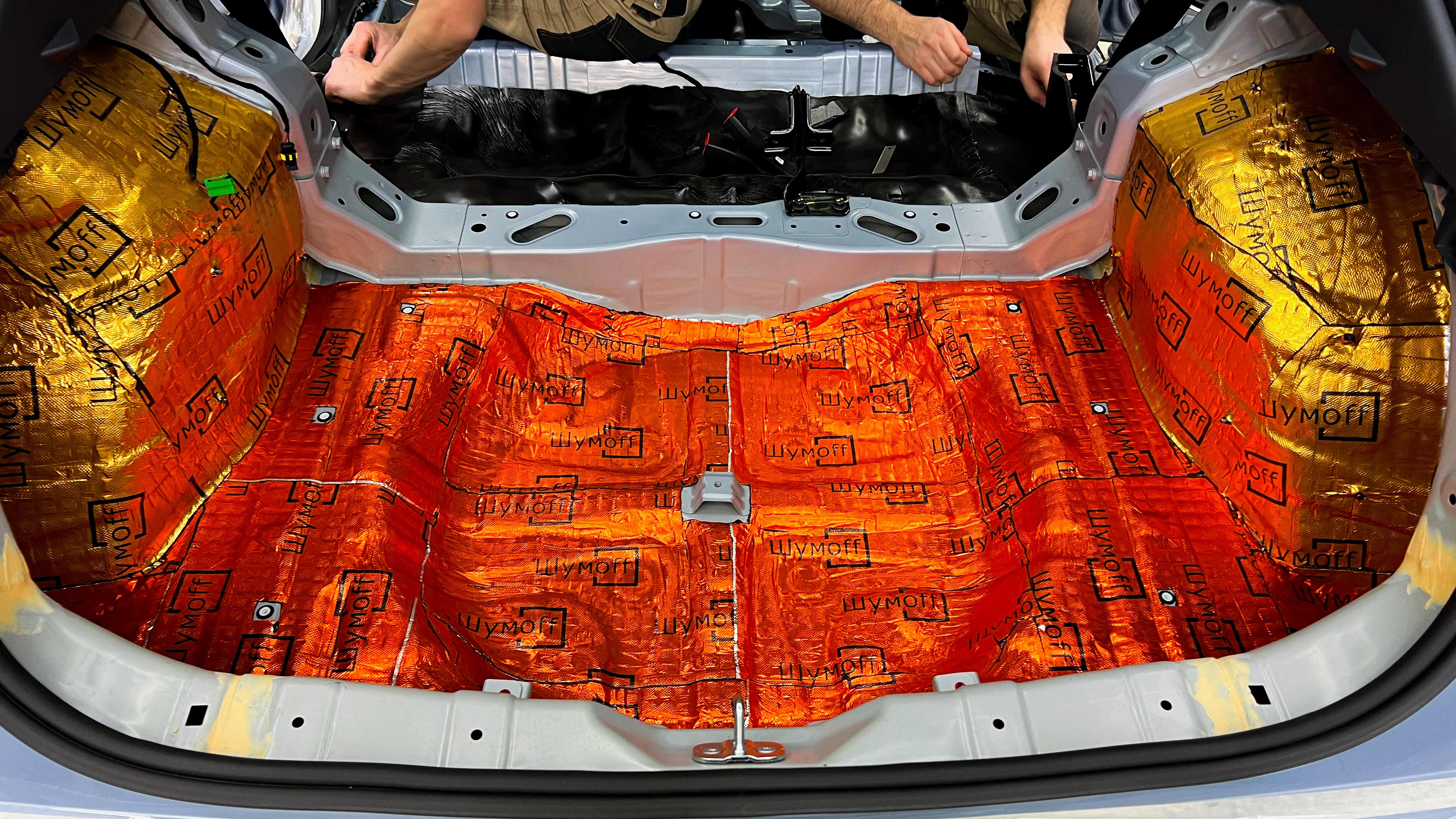 Дно багажника и крылья оклеиваются шумо и теплоизолятором Pin-Up П4 4. Арки оклеиваются шумопоглотителем Flex A15.