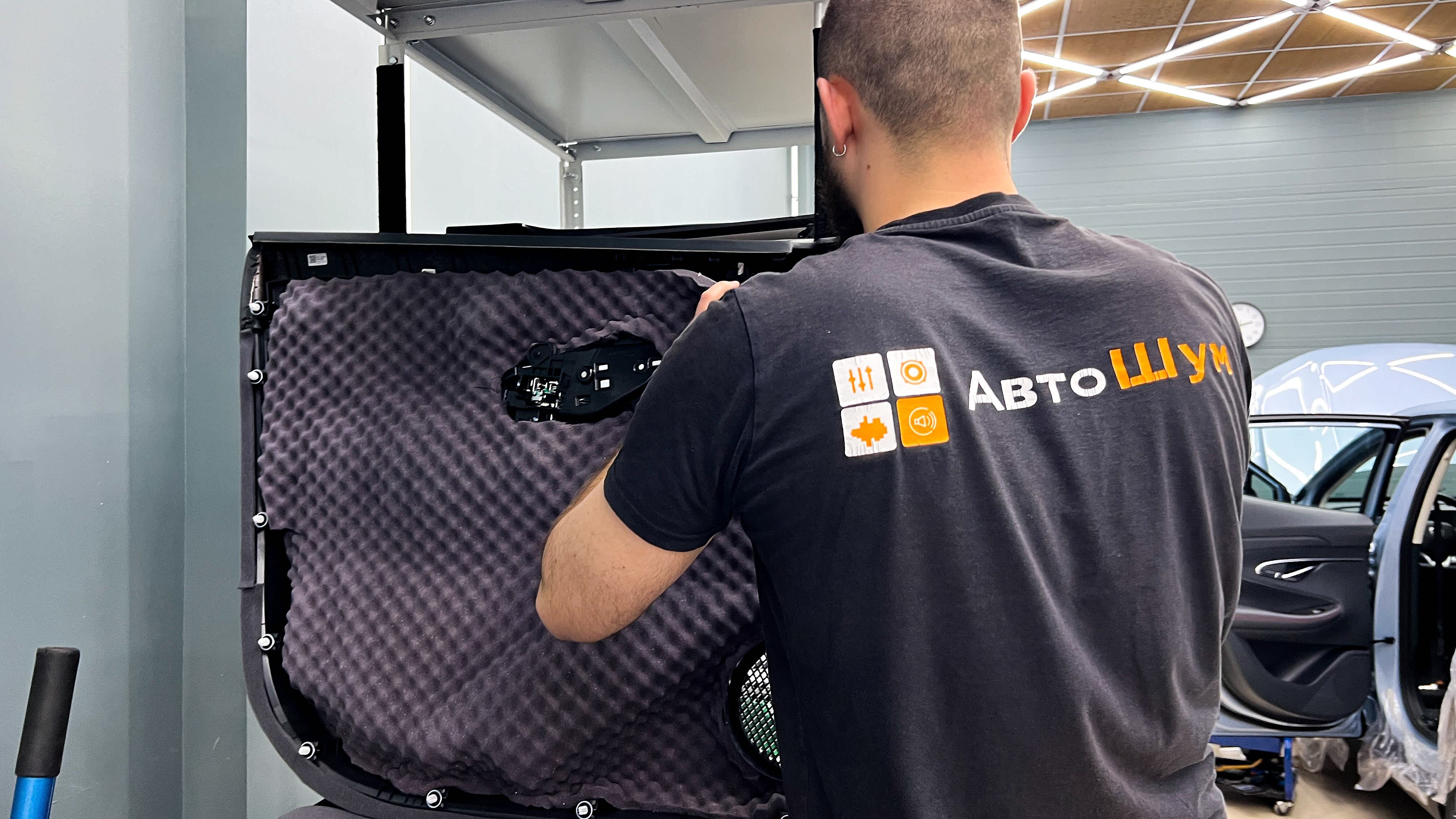 Обшивку пятой двери Pin-Up Absorber А15, а по всему контуру клеим антискрип.