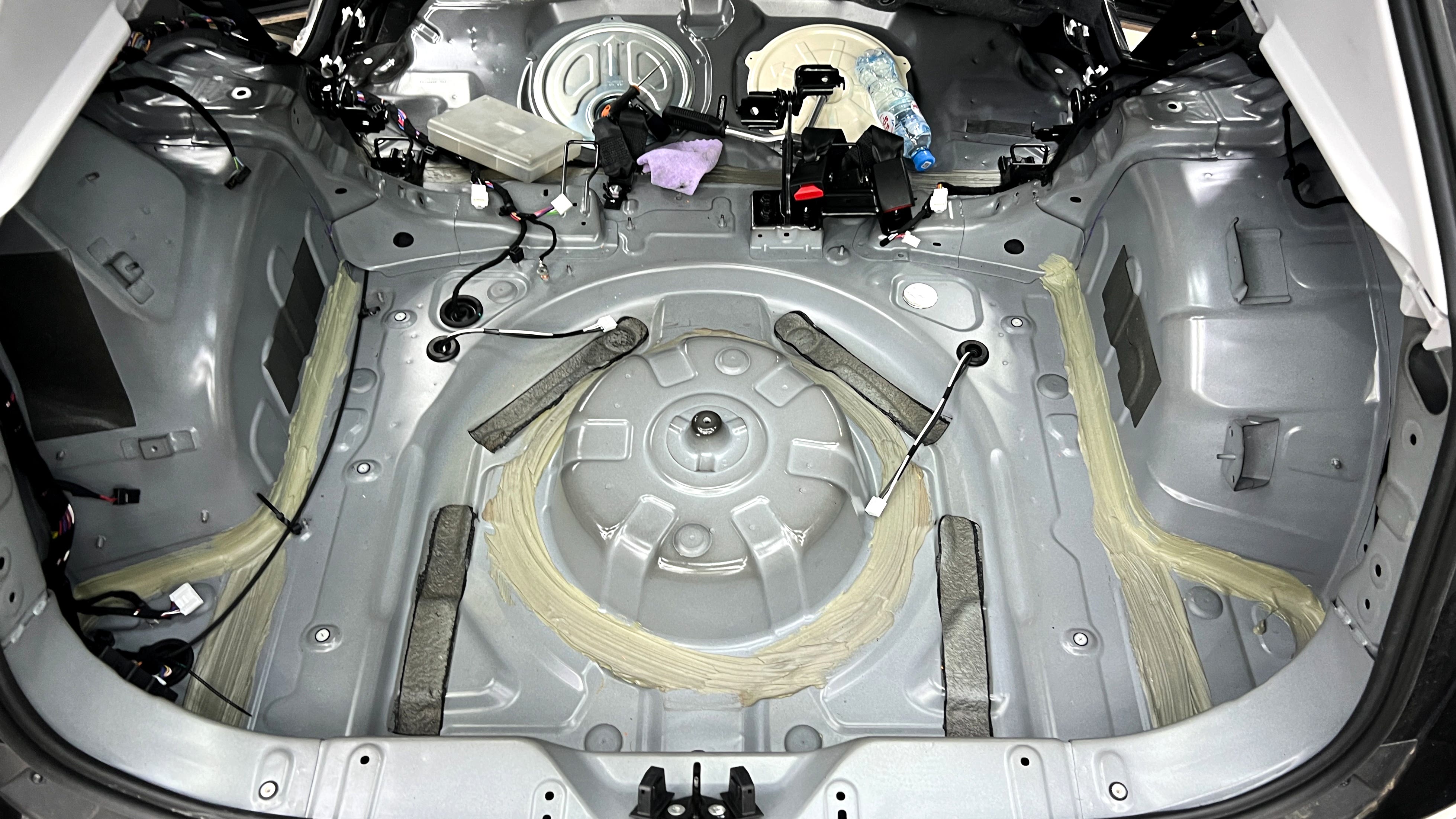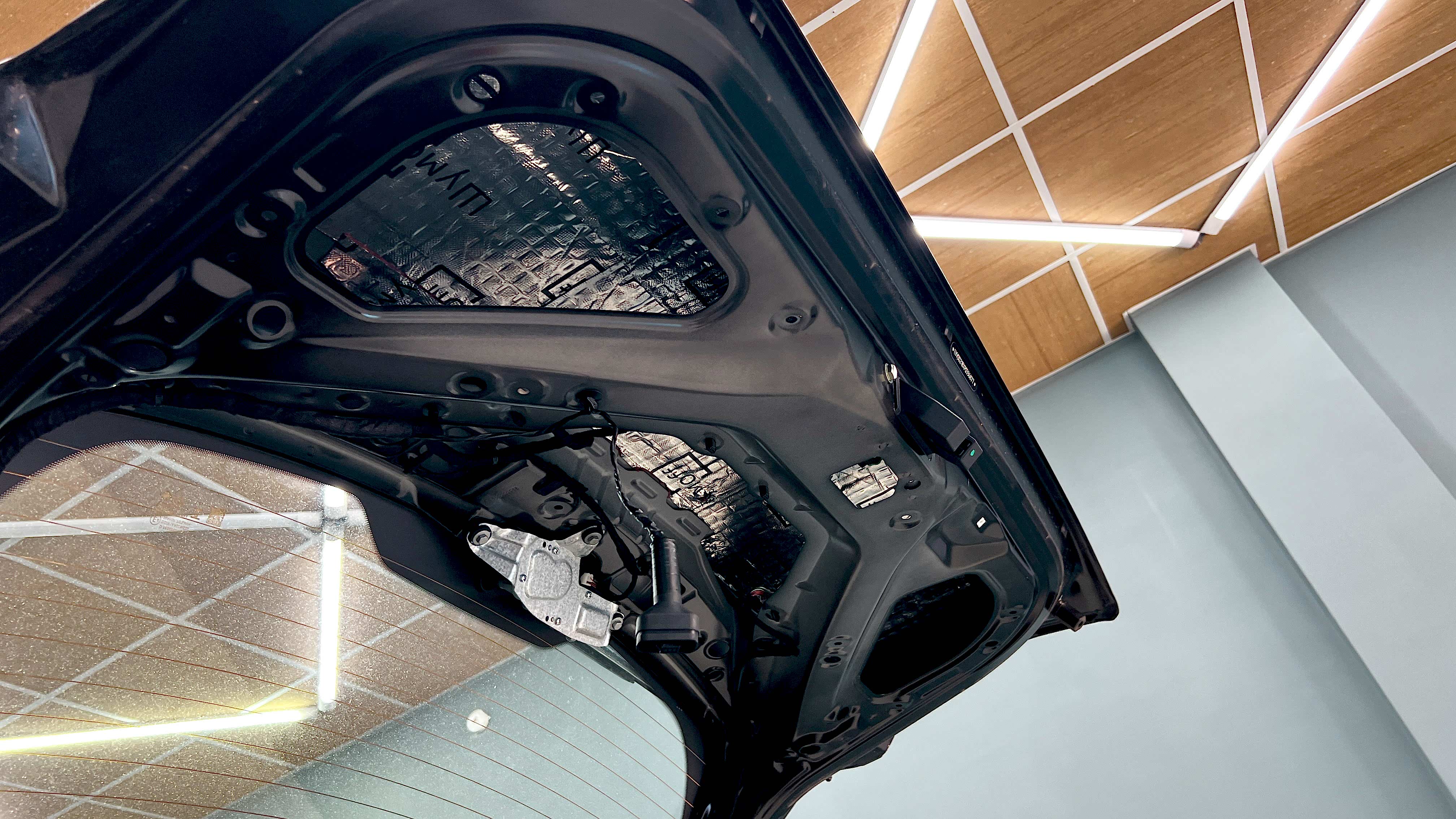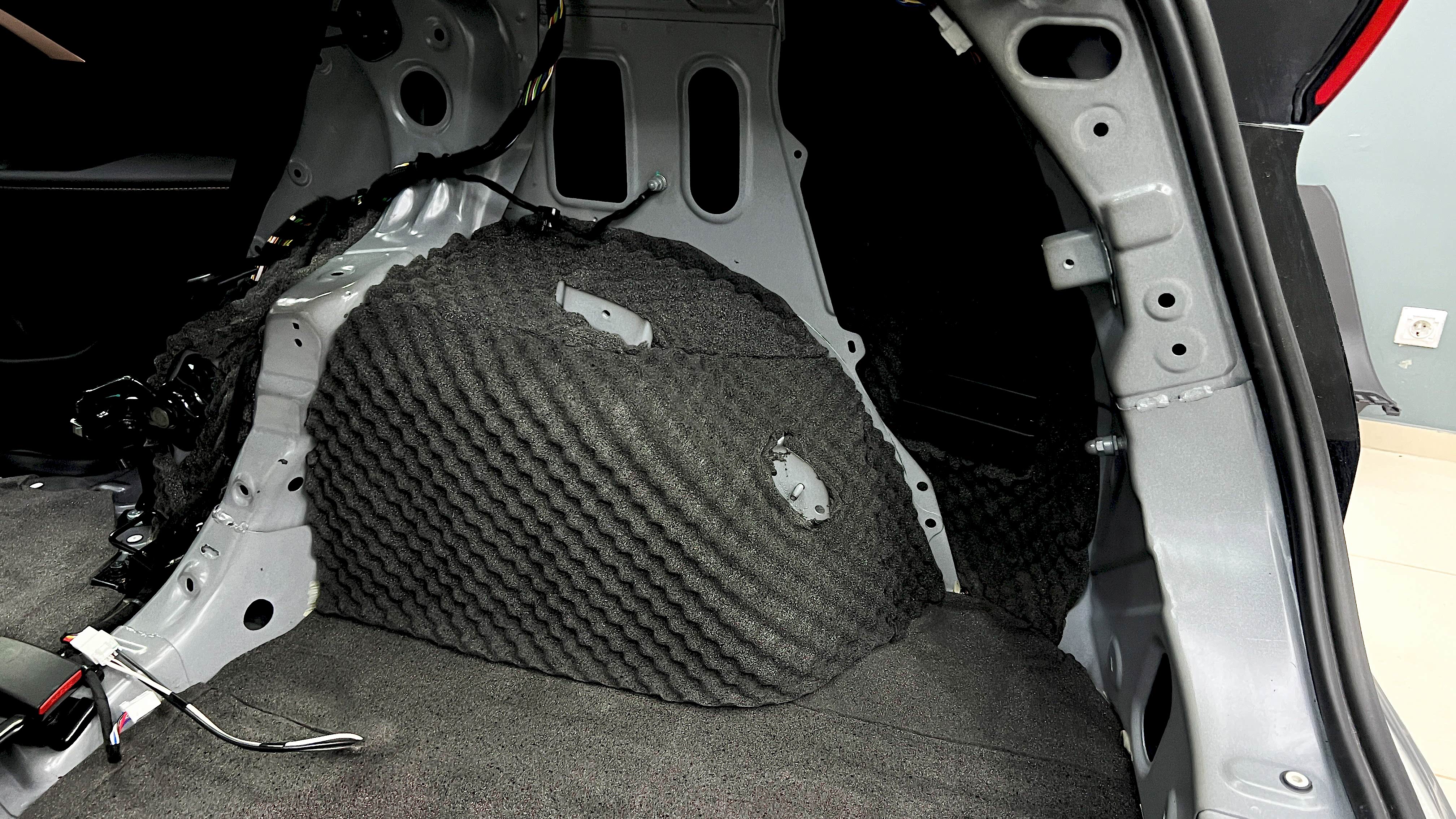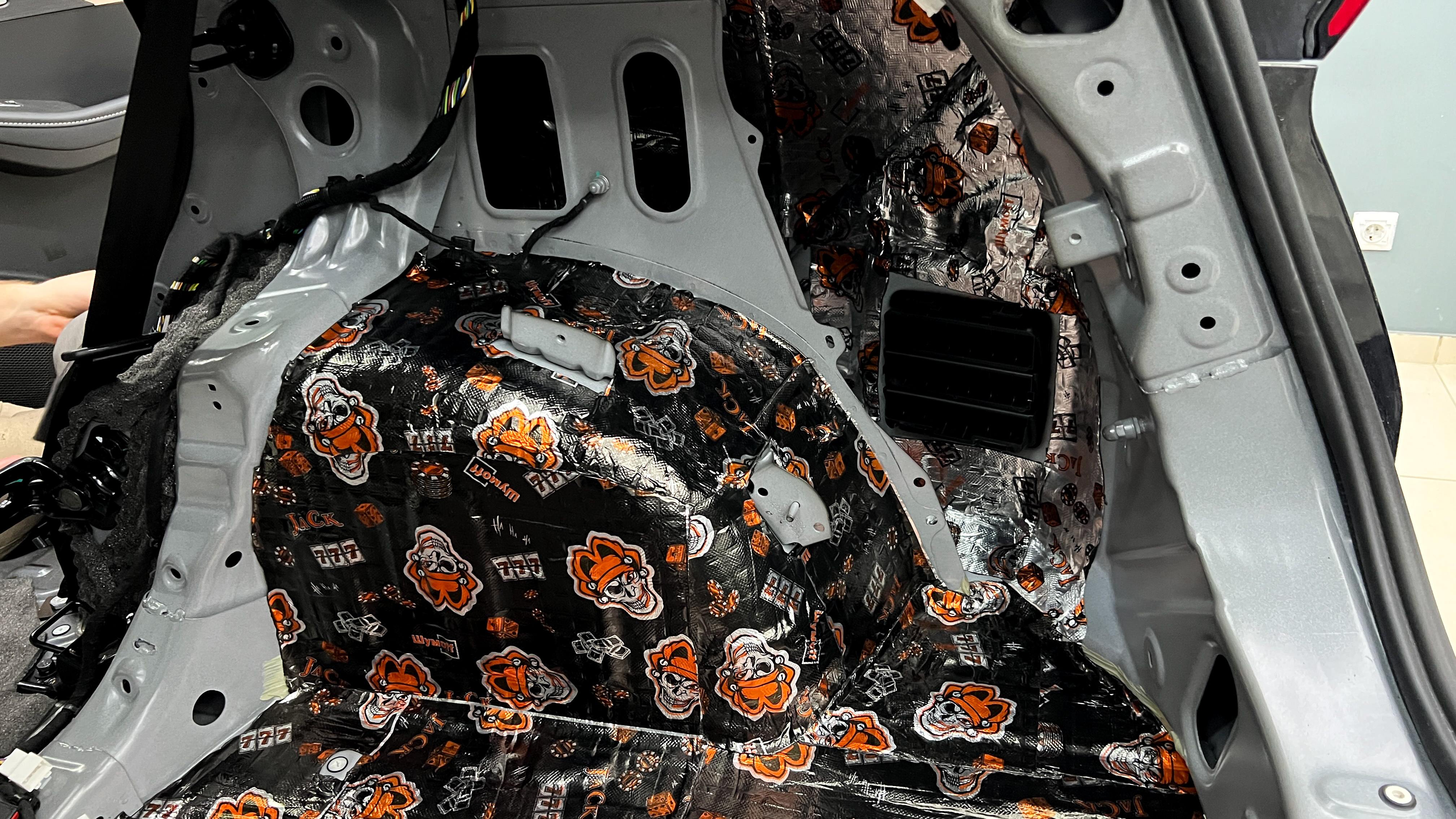 Дно багажника и крылья оклеиваются шумо и теплоизолятором Pin-Up П4 4. Арки оклеиваются шумопоглотителем Flex A15.
