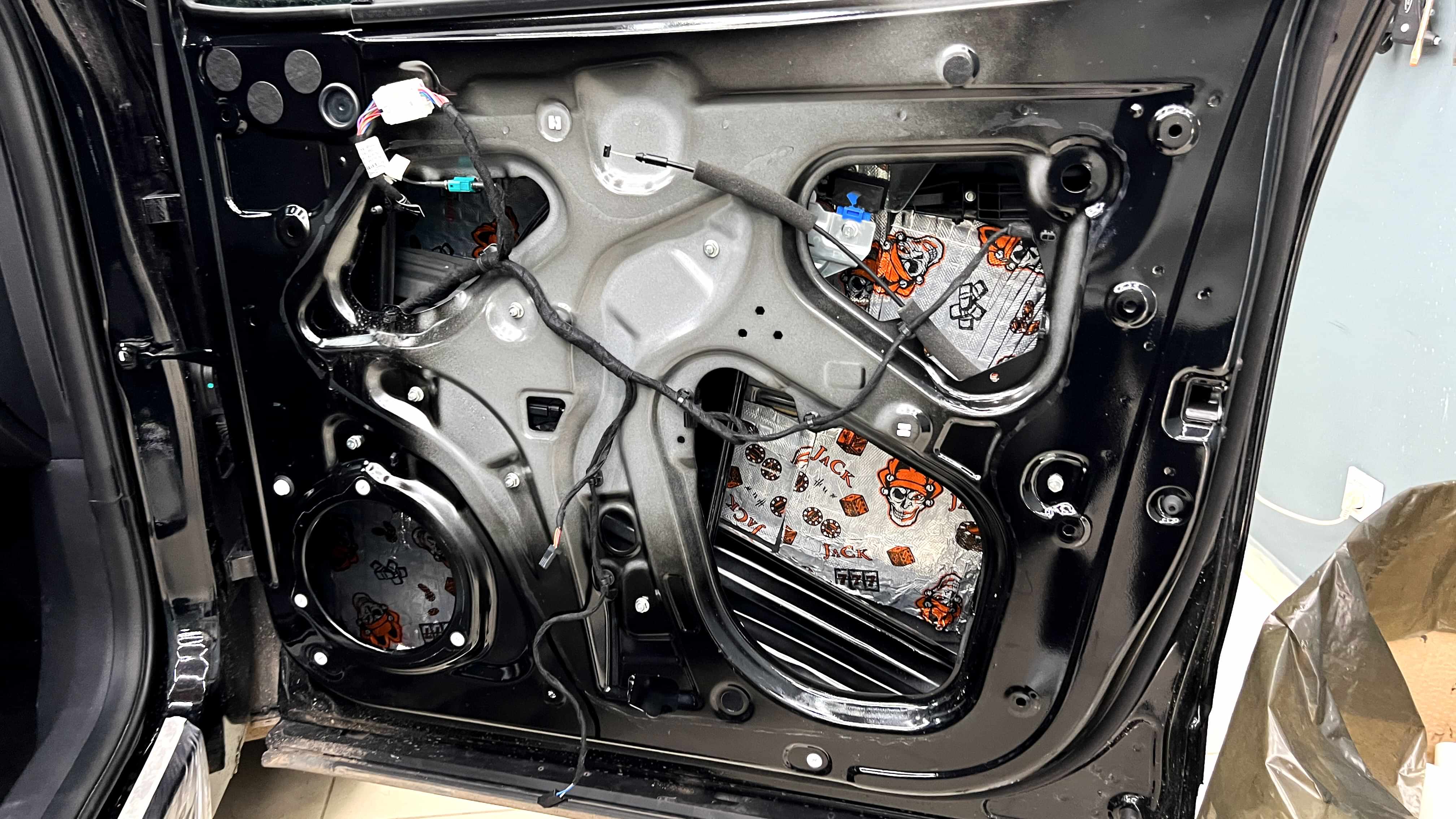 Оклеиваем максимальнуюплощадь Достык, 124 ребер жесткости. Данный материал позволит как снизить внешний шум в салоне, так и за счет уменьшения пере отражений звука внутри двери существенно улучшится качество Pin-Up акустики.