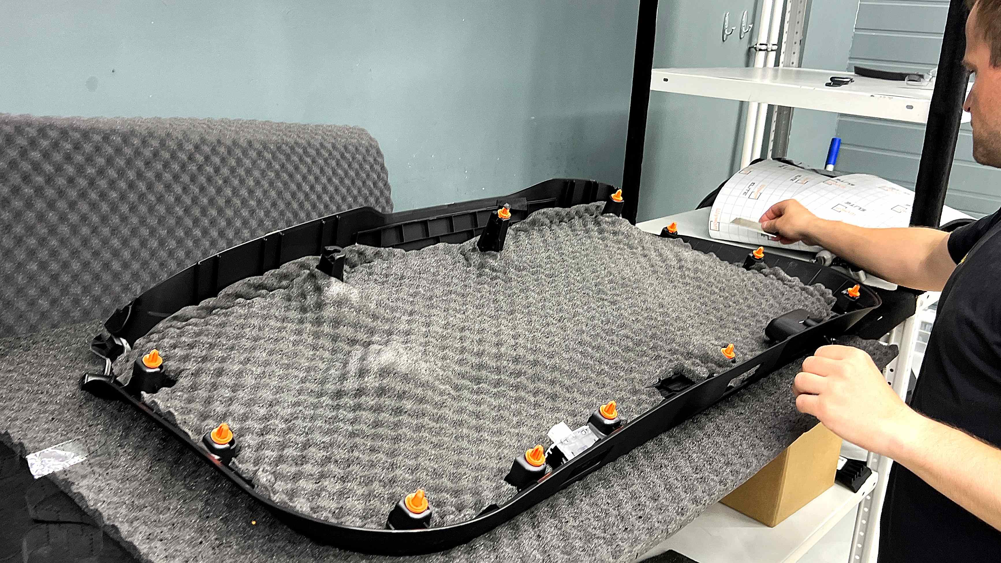 Приступаем к монтажу виброизоляции. Первым слоем на Pin-Up арки наносим толстую и эффективную виброизоляцию Шумофф М4. Перед нанесением, для более сильной адгезии материал прогревается в специальной печи.