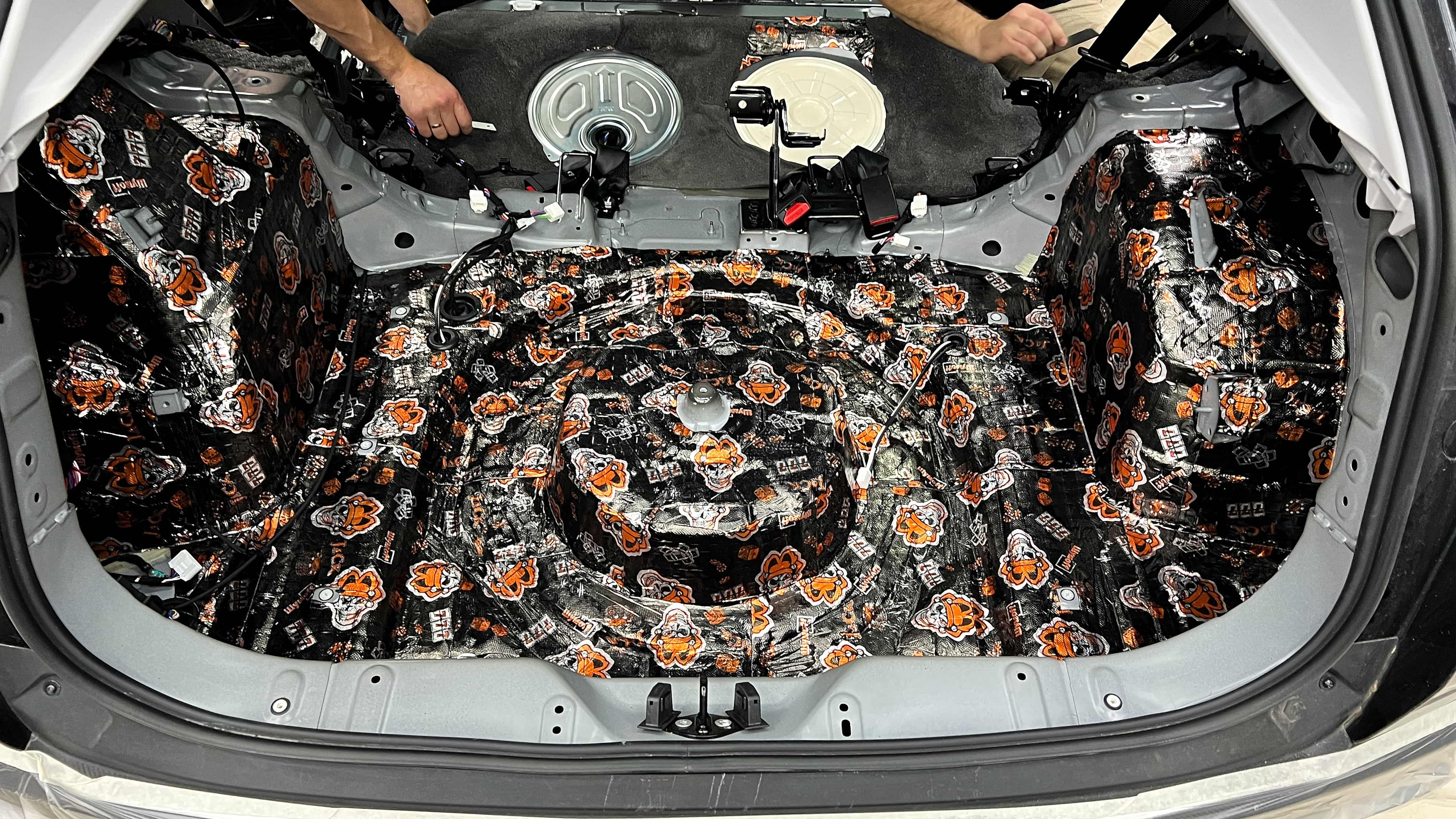 Обезжириваем поверхность и приступаем к монтажу второго слоя. Также для получения Pin-Up эффективного результата используем компоновку из двух материалов На дно багажника клеим Шумофф Base 4. Этот слой позволит снизить нам шум от дороги.