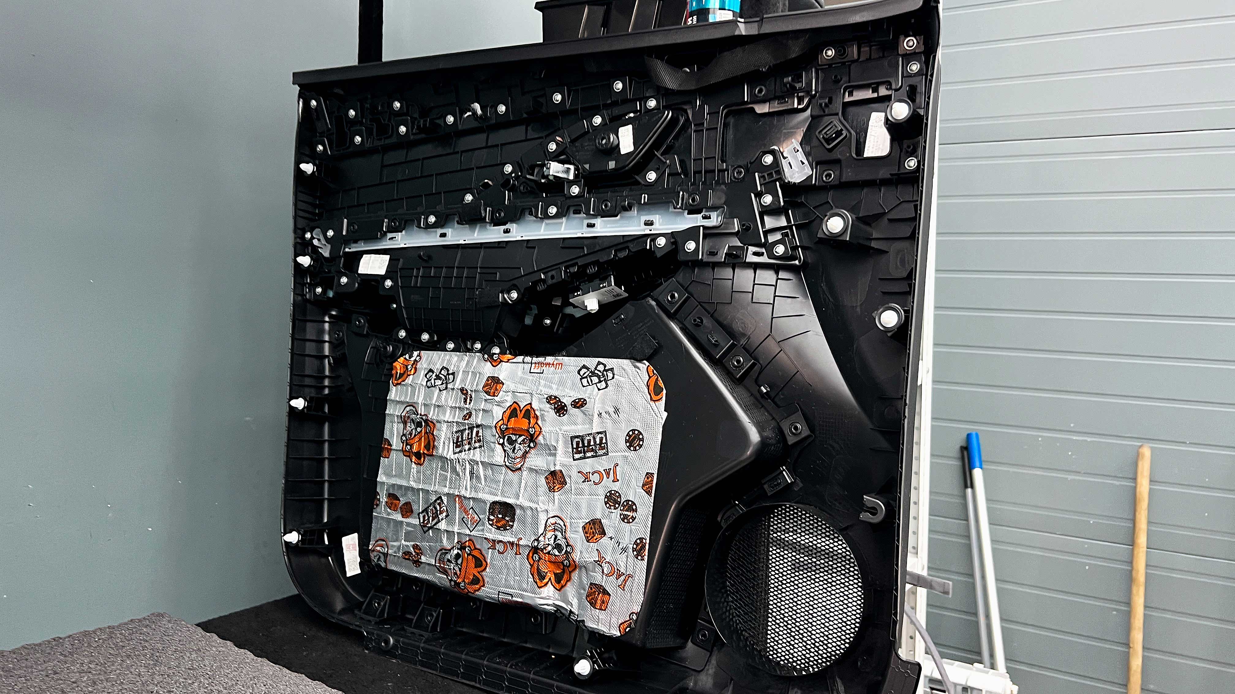 Переходим к оклейке самого корпуса панели, первым слоем частично наносим виброизоляцию Шумофф Joker, создавая тем самым идеальный баланс. Такая Pin-Up оклейка позволит нам чрезмерно не утяжелять панель и придать ей необходимую сбитость