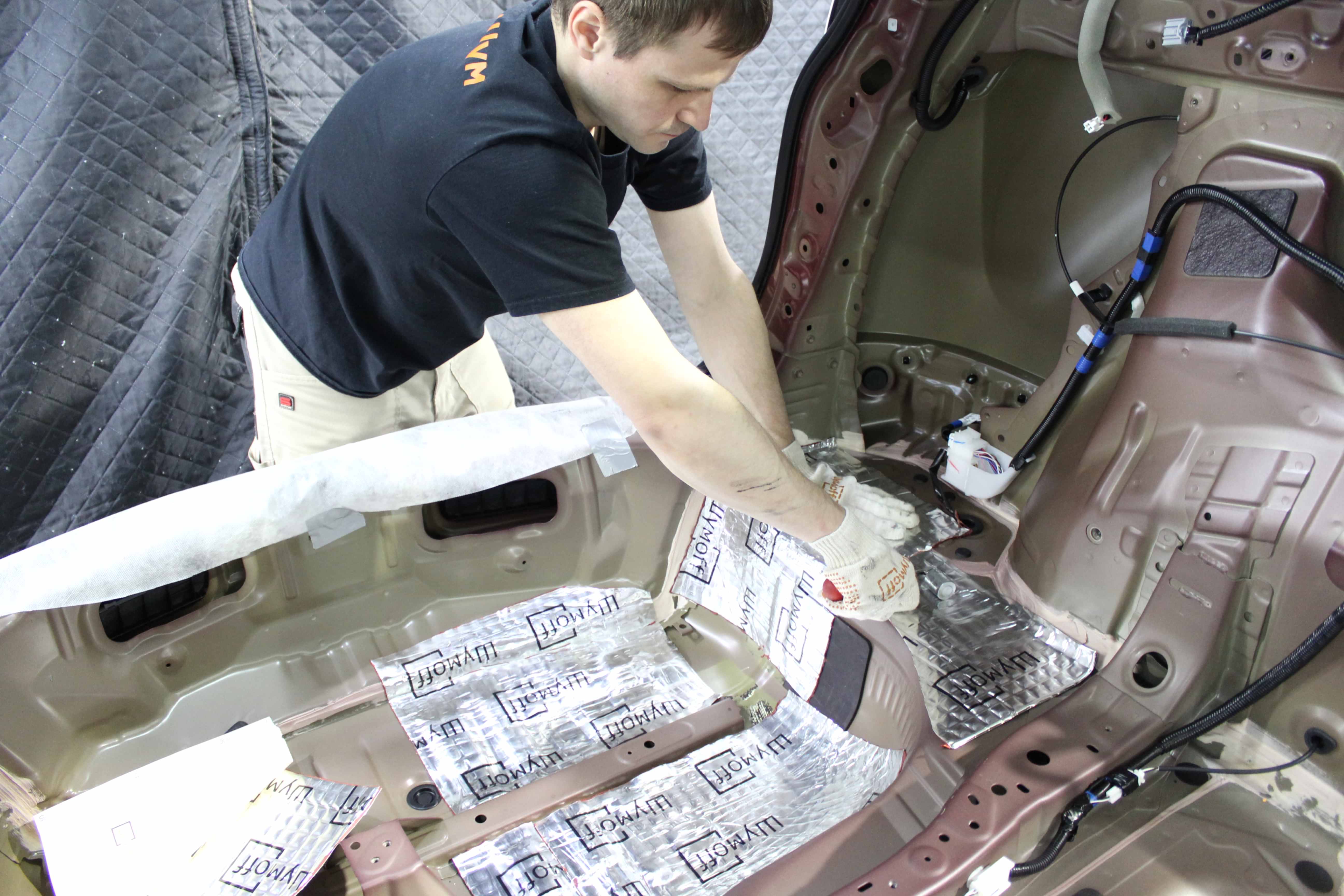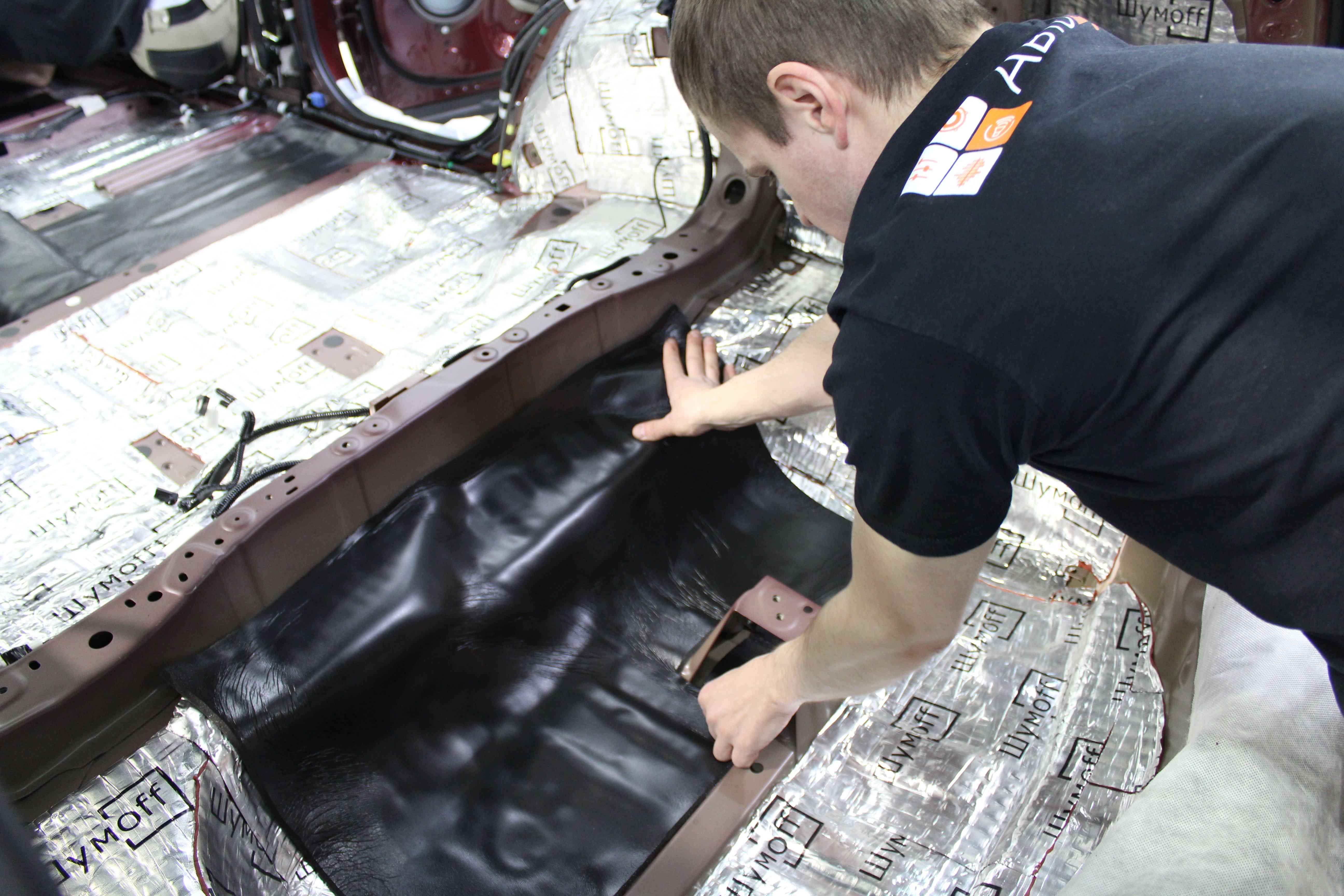 Оклеиваем максимальнуюплощадь Назарбаева, 44 за исключением усилителей и ребер жесткости. Данная компоновка материалов позволит идеально достичь нужной эффективности при минимальном Pin-Up веса, что вместе с виброизоляцией пола также поможет нам снизить вибрацию от дороги, увеличить целостность и сбитость авто.